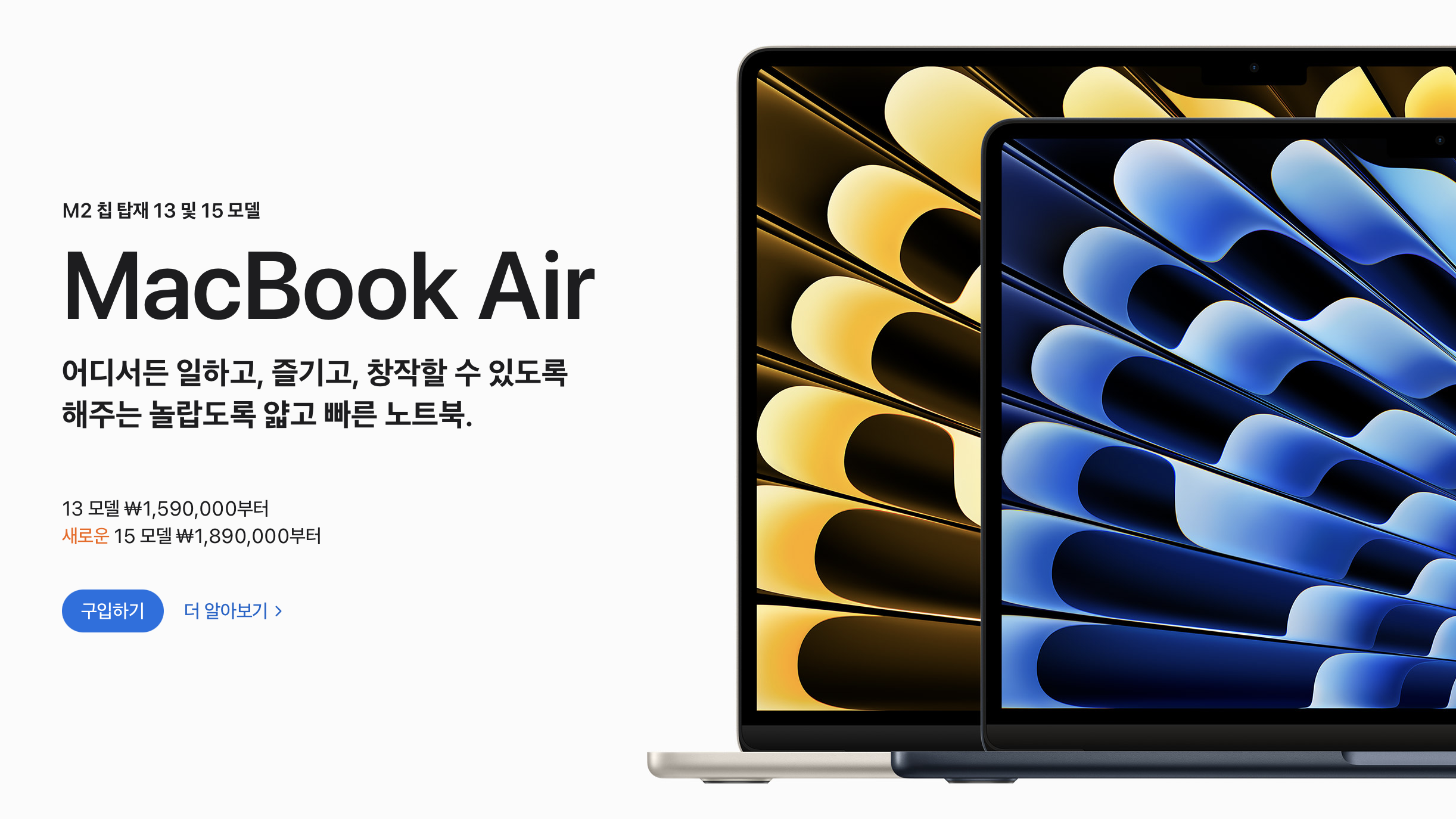 이 글을 쓰는 시점은 2023년 11월 22일 M3칩을 사용하는 맥북 프로가 출시되었고 출시일 만을 기다리고 있는 시점에서 기다렸다 프로로 갈 것인가 그냥 Air M2로 갈 것인가를 고민했는데, 역시나 가격의 압박으로 맥북 에어 M2 칩셋을 구매하게 되었습니다.