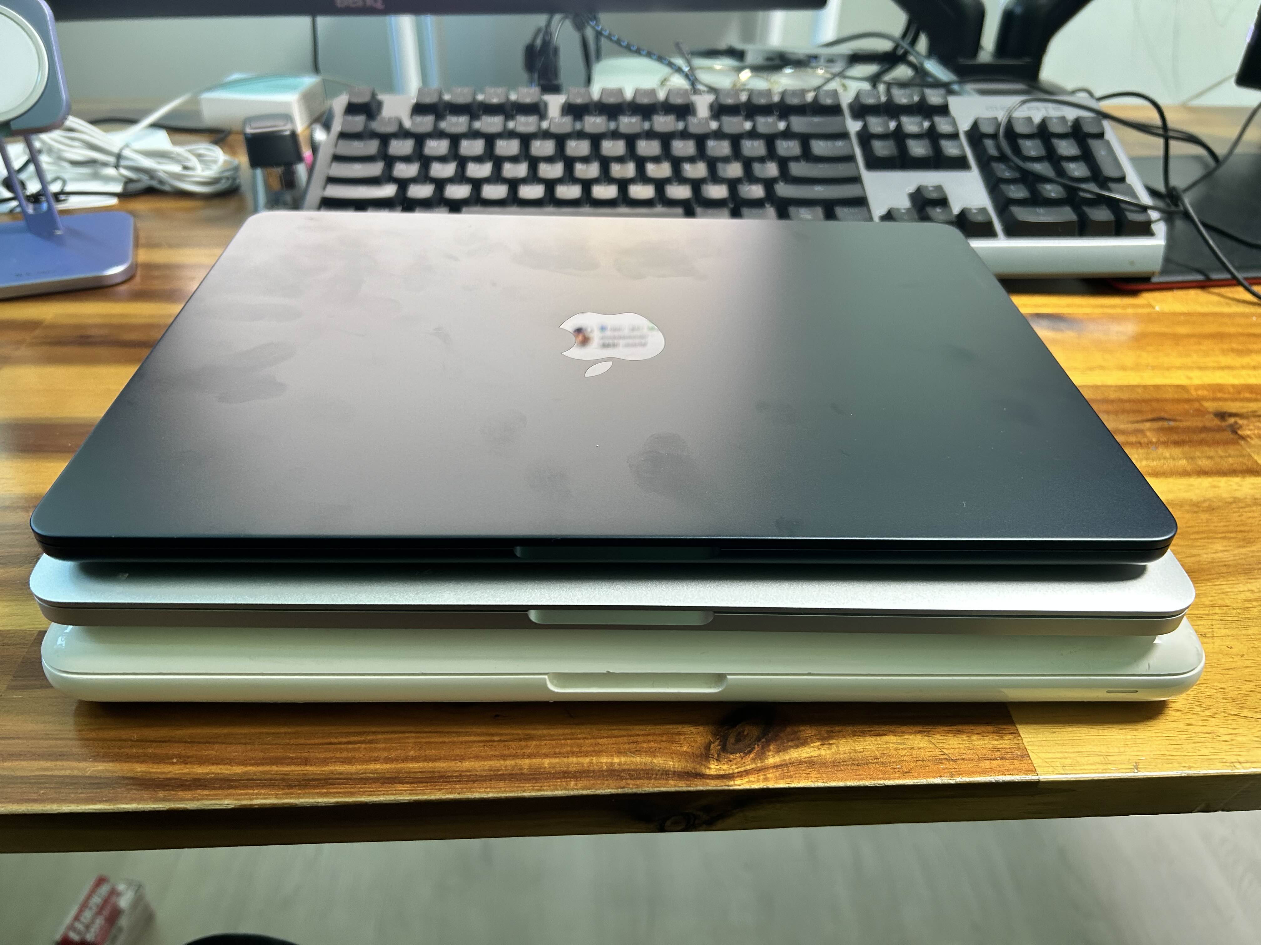 다음은 맨 아래에 맥북 흰둥이, 중간에 맥북 프로, 맨 위에 이번에 구매한 맥북에어(M2)의 모습입니다. 크기와 두께가 차이가 나는 것을 알 수 있습니다.
