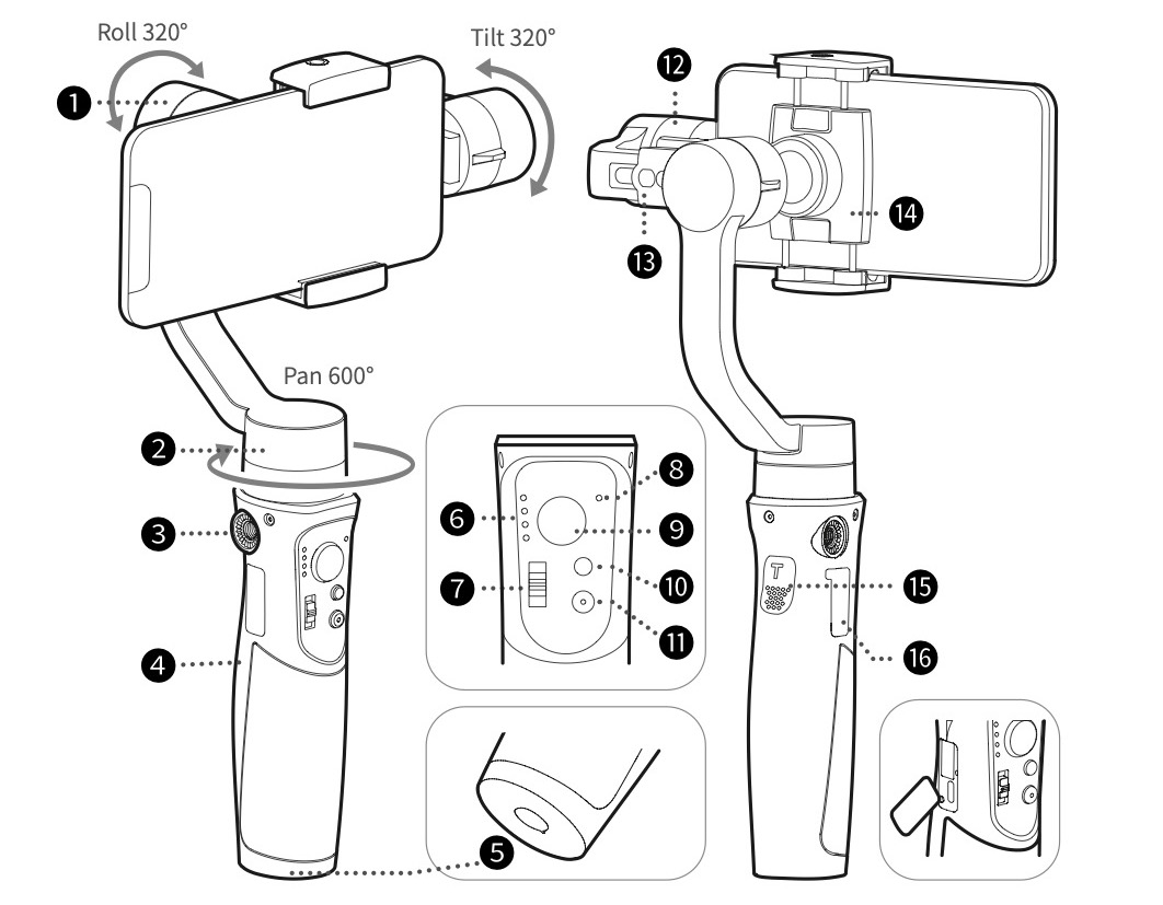 | 8. 블루투스 표시등 | 16. USB(전원출력=핸드폰 충전), Type C(짐벌충전) |
