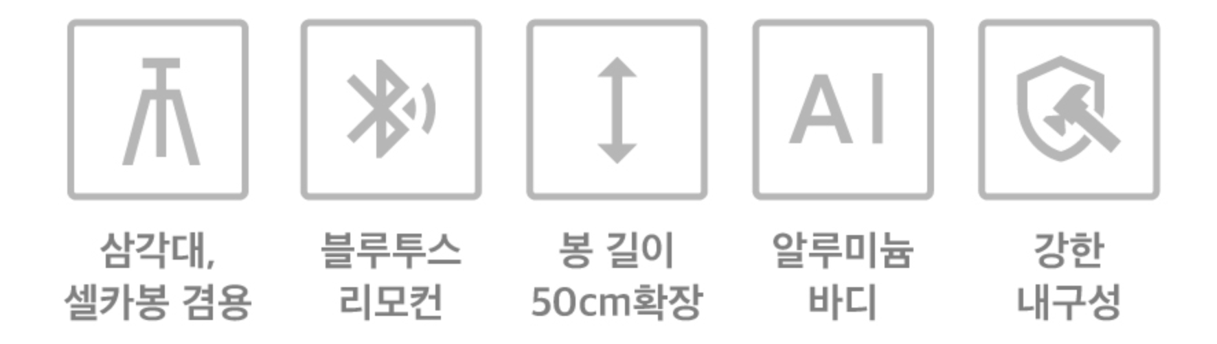 아래 사진에서 왼쪽 본체와 오른쪽 하단(삼각대) 가 기본세트고 오른쪽의 연장 스틱(리모콘 포함)은 별도 구매입니다.