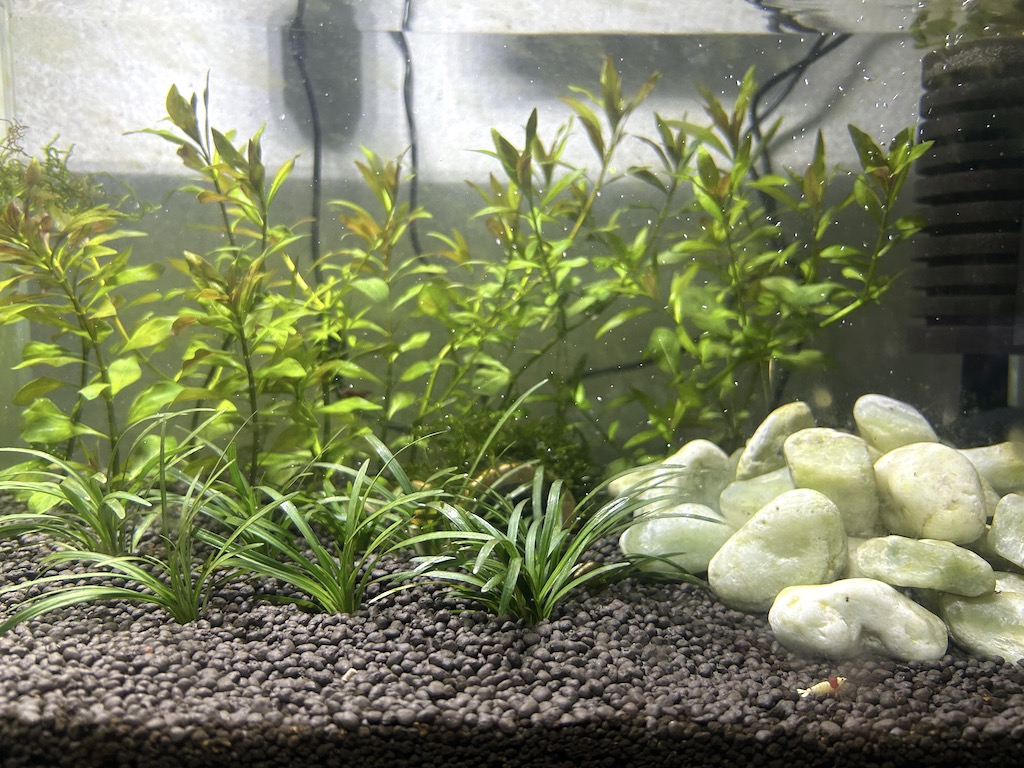 물맞댐을 하고 CRS 새우들을 투입하였는데, 초기에 관리를 잘못해 몇마리 별이되고 이제 어느정도 안정이 된 것처럼 보입니다.