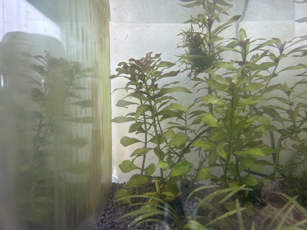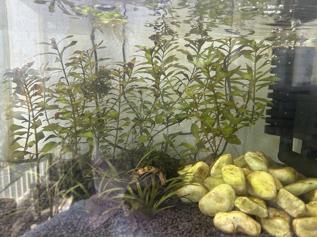 수초에 묻어있는 이끼와 흰색 돌에 있는 갈색이끼 등은 물이 잡히면 자연스럽게 없어질 것이라 생각해서 시간을 들여 갈색이끼를 제거해 볼 생각입니다. ^^